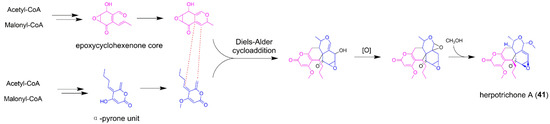 Herpotrichone A (41) is a fungal polyketide isolated from the isopod-associated fungus Herpotrichia sp. SF09 with an unprecedented pentacyclic 6/6/6/6/3 skeleton, and shows outstanding anti-neuro inflammatory activities in lipopolysaccharide (LPS)-induced BV-2 microglial cells (Figure 8) [54]. Interestingly, compound 41 is also an intermolecular [4 + 2] adduct that involves the coupling of epoxycyclohexenone and α-pyrone two building blocks via the Diels–Alder addition. Recently, the biosynthetic pathways of epoxycyclohexenone-derived fungal polyketides trichoxide, sordarial, and flavoglaucin have been investigated in detail, which provide new insights into the biosynthesis of the naphthalenone unit in 41 [55,56,57]. The biosynthesis of some fungal α-pyrone-linked NPs such as alternapyrones and citreoviridin have been reported. The α-pyrone moiety in alternapyrones and citreoviridin is indeed formed by the spontaneous intramolecular cyclization of PKS AlpA and CtvA, respectively [58,59]. Thus, herpotrichone A might share the similar strategy to forge the α-pyrone unit by utilization of an unidentified PKS. Overall, fungal NPs with intermolecular Diels–Alder addition features usually have novel carbon skeletons. The unexpected architectures of these compounds may open an interesting topic such as the characterization of two separate BGCs crosstalk, and discovery of more fungal intermolecular Diels–Alderases.