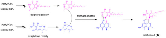 Citrifuran A (42) is produced by the centipede intestine-associated Aspergillus sp. through solid fermentation (Figure 7), and showed moderate inhibitory activities against LPS-induced NO production in RAW 264.7 macrophages [60]. The novel skeleton of citrifuran A was constructed by coupling of azaphilone and furanone moieties via Michael addition (Figure 9). It is obvious that the two separate BGCs’ crosstalk is indispensable to the biosynthesis of 42. The furanone moiety was also contained in fungal polyketide gregatin A. For gregatin A biosynthesis, a single PKS GrgA with the aid of a trans-acting enoylreductase GrgB could biosynthesize the C4 and C11 carbon chains. More interestingly, a predicted hydrolase GrgF is responsible for the fusion two carbon chains to produce the furanone skeleton of gregatin A [61]. This unusual chain-fusing reaction might be also suitable for the biosynthesis of furanone scaffold in 42 (Figure 9). The fungal polyketide-derived mycotoxin citrinin also possesses azaphilone building block. The individual biosynthetic steps of citrinin have been studied by a combination of targeted gene knockout and heterologous gene expression in A. oryzae [62], which might provide new clues for investigation of the biosynthetic mechanism of 42. Though the biosynthetic pathways for azaphilone and furanone have been investigated, the enzyme for catalyzation of Michael addition has not yet been identified, and needs further exploration.