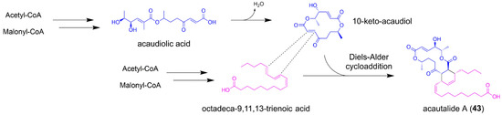 The fungal polyketide acautalide A (43) is produced from the solid-state cultivation of isopod Armadillidium vulgare-associated Acaulium sp. H-JQSF on rice medium, and exhibits neuroprotective bioactivity with antiparkinsonic potential in the 1-methyl-4-phenylpyridinium-challenged nematode model [63]. The architectural features of 43 indicated that two biosynthetic precursors 10-keto-acaudiol and octadeca-9,11,13-trienoic acid intertwined together through intermolecular Diels–Alder cycloaddition (Figure 10). The 10-keto-acaudiol unit is proposed to be an early-stage precursor in the biosynthesis of acaulide and acaulins, two fungal macrodiolides previously isolated from the Acaulium sp. H-JQSF [64,65]. However, the biosynthetic mechanism of 10-keto-acaudiol remains unclear. The octadeca-9,11,13-trienoic acid motif might be derived from the biosynthesis of fungal polyunsaturated fatty acids, either biosynthesized from the fungal desaturation of octadecanoic acids in rice. Interestingly, the obtained 43 was in enantiomerically pure form, thus the Diels–Alder cycloaddition might be truly enzymatic. A fungal Diels–Alderase could be expected to catalyze the intermolecular [4 + 2]-cycloaddition in the assembly line of 43 [63].