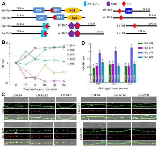 Sequence, transcription and subcellular features of FlbA–FlbE in B. bassiana. (A) Sequence comparison of FlbA–FlbE between B. bassiana (Bb) and A. nidulans (An). Domains and nuclear localization signal (NLS) were predicted from each protein sequence at http://smart.embl-heidelberg.de/ (accessed on 20 March 2022) and http://nls-mapper.iab.keio.ac.jp/ (accessed on 20 March 2022), respectively. (B) Relative transcript (RT) levels of flbA–flbE in the SDAY cultures of wild-type Bb strain (WT) during a 7-d incubation at the optimal regime of 25 °C in a light/dark (L:D) cycle of 12:12 with respect to the standard level on day 2. (C) LSCM images (scales: 5 μm) for subcellular localization of green fluorescence-tagged Flb fusion proteins expressed in the WT strain. Cell samples were taken from the 3 d-old SDBY cultures grown at 25 °C in the respective L:D cycles of 0:24, 12:12 and 24:0 and stained with the nuclear dye DAPI (shown in red). Each four-image panel show bright, expressed (green), stained (red nuclei) and overlapped (yellow nuclei) images of the same field, respectively. (D) Nuclear versus cytoplasmic green fluorescence intensity (N/C-GFI) ratios of the fusion proteins in the hyphal cells. Error bars denote standard deviations (SDs) of the means from three cDNA samples analyzed via qPCR (B) or 33 to 35 cells in the examined hyphae (D).