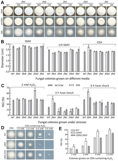 Radial growth rates of Δflb mutants (DM) and control (WT and CM) strains in B. bassiana. (A,B) Images (scale: 10 mm) and diameters of fungal colonies grown at the optimal regime of 25 °C and L:D 12:12 for 7 d on rich medium SDAY, 1/4 SDAY and minimal medium CDA after initiated with 103 conidia. (C) Relative growth inhibition (RGI) percentages of fungal colonies incubated at 25 °C for 7 d on CDA containing H2O2 and of SDAY colonies incubated at 25 °C for 5-d growth recovery after exposing 2 d-old colonies to a 42 °C heat shock for 3 or 6 h. (D,E) Images (scale: 10 mm) and relative growth inhibition of the ΔflbD and control strains incubated for 6.5 d on H2O2-containing CDA plates. * p < 0.05 (Tukey’s HSD). Error bars: SDs from three replicates.