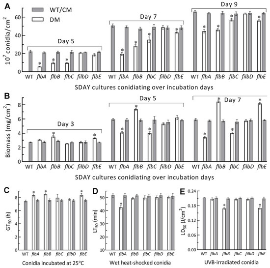 Aerial conidiation and conidial quality of Δflb mutants (DM) and their control (WT and CM) strains in B. bassiana. (A,B) Conidial yields and biomass levels measured from the SDAY cultures during a 9-d incubation at the optimal regime of 25 °C and L:D 12:12, respectively. The cultures were initiated by spreading 100 μL aliquots of a 107 conidia/mL suspension. (C–E) Median germination time GT50 (h) for conidial viability at 25 °C, LT50 (min) for conidial tolerance to a 45 °C wet–heat stress and LD50 (J/cm2) for conidial resistance to UVB irradiation, respectively. *p< 0.05 in Tukey’s HSD tests. Error bars: SDs of the means from three independent replicates.