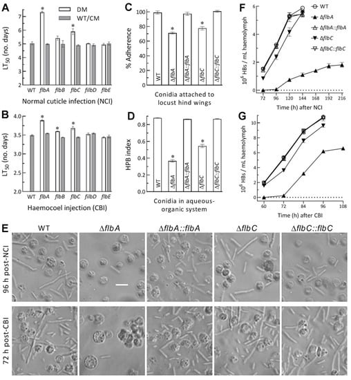 For insight into significantly attenuated virulence of ΔflbA and ΔflbC via both NCI and CBI, cellular events critical for NCI and hemocoel colonization by proliferation in vivo were compared between the two mutants and their control strains. As a crucial trait for initiation of NCI, conidial adherence to locust wing cuticle was lowered by 29% and 23% for ΔflbA and ΔflbC relative to the WT strain, respectively (Figure 4C), accompanied by 52% and 33% reductions in conidial hydrophobicity (Figure 4D) determinant to the adherence [38,39,40,41,42]. A linear correlation was highly significant between the measurements of conidial hydrophobicity and adherence from the tested strains (r2 = 0.975, F1,19 = 116.7, p < 0.0017).