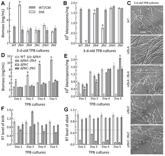 Submerged blastospore production of Δflb mutants (DM) and their control (WT and CM) strains in B. bassiana. (A,B) Biomass levels and dimorphic transition rates measured from the 3 d-old TPB cultures grown at 25 °C, respectively. (C) Microscopic images (scale: 20 μm) for a status of blastospore production in the 3 d-old cultures of a 106 conidia/mL TPB mimicking insect hemolymph. (D,E) Time-course biomass levels and dimorphic transition rates in the TPB cultures incubated at 25 °C for 2–5 d on a shaking bed. (F,G) Relative transcript (RT) levels of the key CDP genes brlA and abaA in the TPB cultures of mutants with respect to the WT standard during the 5-d incubation. The dashed line denotes a significant level of one-fold (50%) downregulation. * p < 0.05 (A,B,D,E) in Tukey’s HSD tests. Error bars: SDs of the means from three independent replicates.