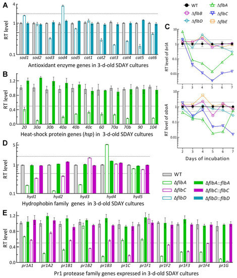 Relative transcript (RT) levels of clustered genes associated with phenotypes of the flb mutants with respect to the WT standard in B. bassiana. The tested cDNA samples were derived from the SDAY cultures initiated by spreading 100 μL aliquots of a 107 conidia/mL suspension and incubated for 3 d (A,B,D,E) or 2–7 d (C) at the optimal regime of 25 °C and L:D 12:12. The lower and/or upper dashed lines denote significant levels of one-fold down- and upregulation, respectively. Error bars: SDs of the means from three independent cDNA samples examined by qPCR analysis.