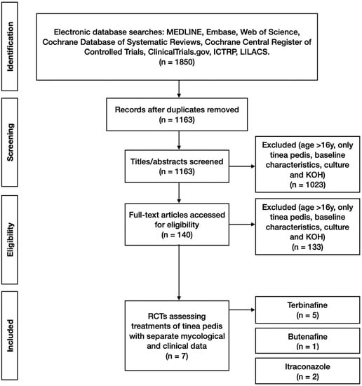 Many now question the need for placebo-controlled trials when there is a known benefit of both classes of anti-fungal agents in treating tinea pedis []. Some consider that there is a lack of long-term data, e.g., 6-month follow-ups, to assess the efficacy of treatments on the recurrence rate of tinea pedis []. More recently, concerns regarding community Trichophyton resistance to terbinafine particularly in India have been raised [,]. The aim of this systematic review is to streamline current evidence for clinicians whilst highlighting areas for future research and troubleshooting problems in study design and interpretation so that future RCTs can be translated into clinical benefit.