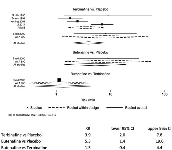 There are a priori relevant assumptions to consider when performing a systematic review; sensitivity, similarity, transitivity and consistency, respectively. Sensitivity analysis was not performed due to the limited number of included studies. Similarity addresses the methodology using the conventional PICO approach of population, intervention, comparison, and outcome. In this systematic review, as is usual, this was conducted initially when screening for eligibility through the inclusion criteria of the systematic reviews. Specifically, similarity was based upon four main aspects: the clinical characteristics of the study, treatment interventions, comparison treatments, and outcome measures. The clinical study design could vary to a degree, often regarding when the outcome assessment was scheduled. There was a range of signs and symptoms assessed, which were not consistent across the studies, making the extent of disease at baseline difficult to compare. Comparison was further confounded by the variety of methods used in different studies to rationalise these signs and symptoms into numerical correlates of ‘clinical cure’ after treatment. In this meta-analysis, the minimum requirement for inclusion was studies that reported baseline characteristics to ensure similarity between arms. We did not exclude studies where the attrition was due to negative cultures at baseline, although this may introduce a degree of selection bias. One study we excluded on the basis of selection bias as the population was previous non-responders []. Regarding the treatment interventions, the topical formulations were consistent in that they all contained 1% of active ingredient. The oral formulation doses differed between terbinafine and itraconazole, but were consistent for each drug and in line with prescription guidance. Topical formulations contained a range of excipients; the topical terbinafine formulation could contain alcohol to enable the terbinafine to enter the skin. Enabling the penetration of the active ingredient into the skin is likely to promote retention and hence affect the dynamics of exposure to the fungal infection. Factors such as this make it difficult to determine if the duration of exposure required to eradicate fungi differs between drug classes (allylamines and azoles). The adherence to these treatments was also never directly assessed in any of the studies. We ensured that, if the clinical assessment of tinea pedis was reported, it was in addition to mycology in the form of KOH microscopy and culture; we focused upon the eradication of the mycology associated with the disease. This was in part due to the lack of a validated clinical assessment protocol for tinea pedis and, hence, it could not be applied in the studies. On occasion it is likely for fungi to be present on the epidermis of feet where disease is not evident; similarly, symptoms associated with the disease may continue after the resolution of the infection—for example, nail changes in onychomycosis persist after eradication of tinea pedis []. In this review the comparison treatments did not present significant variation. Inconsistency and testing between direct and indirect treatments were not evident either globally (p = 0.42) or locally p > |z| 0.42.