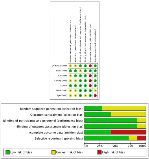 Our analysis showed that five of the seven studies used in the analysis had a high risk of bias in one component of their study (Figure 3). This was predominantly regarding attrition bias, where incomplete outcome data were reported. One study illustrated a selective reporting bias. Although five of the seven studies reported one high risk of bias, there were a considerable number of occasions where there was an unclear risk of bias. This is indicative of a potential bias, as the bias topic received no or poor coverage in the published manuscript; therefore, the bias cannot be assessed.