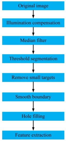The fungal spore diffraction fingerprint collection system is easily affected by the external environment where it works. Diffraction fingerprint images of fungal spores may have uneven brightness and salt and pepper noise. Therefore, in order to reduce the unusable information of the diffracted fingerprint image and retain valid information, the diffractive fingerprint image needs to be preprocessed. The preprocessing flow of the diffraction fingerprint image of fungal spores is shown in Figure 3.