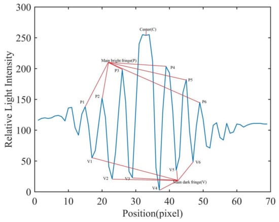 In the diffracted fingerprint image of fungal spores, the light intensity distribution of the diffracted fingerprint area is closely related to the type, size, geometric shape, light absorption, and other factors of the spore. It can be seen from the relative light intensity distribution diagram of the spore diffraction fingerprint (Figure 4) that the diffraction fingerprint was clearest, the visibility is the highest, and the energy is the most concentrated near the center. The interference at the edges decayed rapidly and visibility decreased. The pixel distribution in the area close to the center of the diffracted fingerprint contributed the most to the characteristic value, and the main fringe was more valuable. Therefore, this study mainly chooses the main stripes of the spore diffraction fingerprint as the spore diffraction fingerprint feature for the classification of fungal spores. As shown in Figure 4, a total of 13 diffraction fingerprint features were selected for the classification of fungal spores. These 13 characteristic values were divided into 3 categories, main bright fringe, main dark fringe, and center fringe. Then, these three categories were calculated to obtain Peak to Center ratio (PCR), Valley to Center ratio, and Peak to Valley ratio (PVR). The formulas for calculating these three parameters are as follows: