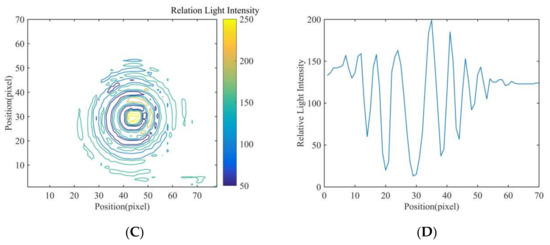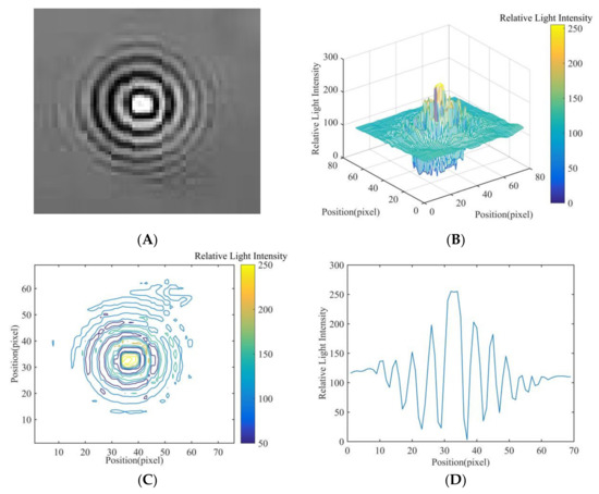 Results of B. cinerea spore fingerprint image processing, (A) diffraction image, (B) three-dimensional relative light intensity distribution, (C) two-dimensional relative light intensity distribution, and (D) relative light intensity distribution value.