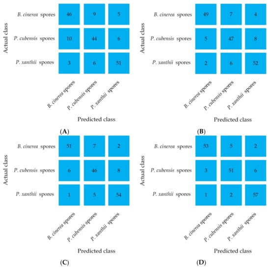 Instability caused by possible sample size bias was considered when classifying pathogenic spores’ diffraction fingerprint images from the three diseases using the LR model, and a one-to-one classification method was used. The LR algorithm chooses L2 as the regular term. When the KNN model was used to classify pathogenic spores’ diffraction fingerprint images, 70% of the training set was reclassified considering the number of samples, and the K value of the KNN algorithm was estimated by 10-fold cross-validation. When using the RF model to classify pathogenic spores’ diffraction fingerprint images, in order to achieve the purpose of extracting equal samples, the adopted sampling method was put back into the sampling. SVM algorithm uses a Gaussian kernel function and adopts a one-to-one classification method. In this study, a confusion matrix was used to evaluate the performance of the classifier. As shown in Figure 8, each row of the matrix represents the actual category for the sample, and each column represents the predicted category for the sample. The numbers on the diagonal of the matrix represent the number of samples correctly identified for each category [36]. The results of the LR classification model (Figure 8) show that 46, 44, and 51 samples of B. cinerea spores, P. cubensis spores, and P. xanthii spores were correctly identified. Among them, 9 samples of B. cinerea spores were predicted to be P. cubensis spores, and 5 samples of B. cinerea spores were predicted to be P. xanthii spores. For the P. cubensis spores, 10 samples were predicted to be B. cinerea spores, and 6 samples were predicted to be P. xanthii spores. For the P. xanthii spores, 3 samples were predicted to be B. cinerea spores, and 6 samples were predicted to be P. cubensis spores. The results of the KNN classification model show that 7 samples of B. cinerea spores were predicted to be P. cubensis spores, and 4 samples of B. cinerea spores were predicted to be P. xanthii spores. For the P. cubensis spores, 5 samples were predicted to be B. cinerea spores, and 8 samples were predicted to be P. xanthii spores. For the P. xanthii spores, 2 samples were predicted to be B. cinerea spores, and 6 samples were predicted to be P. Cubensis spores. The results of the RF classification model show that 7 samples of B. cinerea spores were predicted to be P. cubensis spores, and 2 samples of B. cinerea spores were predicted to be P. xanthii spores. For the P. cubensis spores, 6 samples were predicted to be B. cinerea spores, and 8 samples were predicted to be P. xanthii spores. For the P. xanthii spores, 1 sample was predicted to be B. cinerea spores, and 5 samples were predicted to be P. cubensis spores. The results of the SVM classification model show that 5 samples of B. cinerea spores were predicted to be P. cubensis spores, and 2 samples of B. cinerea spores were predicted to be P. xanthii spores. For the P. cubensis spores, 3 samples were predicted to be B. cinerea spores, and 6 samples were predicted to be P. xanthii spores. For the P. xanthii spores, 1 sample was predicted to be B. cinerea spores, and 2 samples were predicted to be P. cubensis spores.