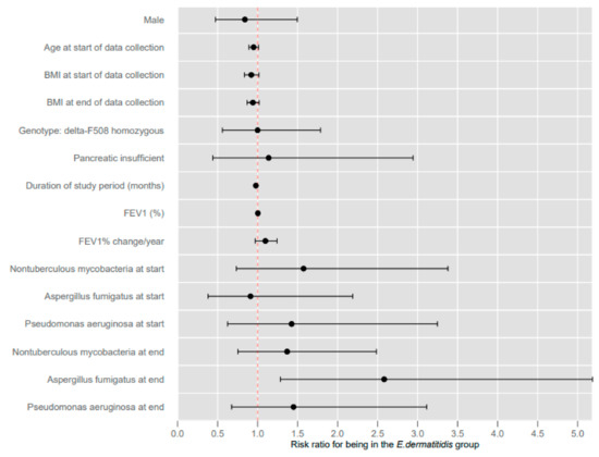 Despite treatment advances, lung disease remains the major cause of mortality and morbidity in CF, and strategies to minimize pulmonary exacerbations and maintain lung health remain of paramount importance. Percent predicted forced expiratory volume in one second (FEV1%) is routinely used by clinical teams and registries to monitor clinical stability, stratify disease severity and assess treatment outcomes []. The rate of lung function decline, determined by comparison of FEV1% values over time, is perhaps an even more relevant and better predictor of clinical deterioration []. Prior studies have suggested that E. dermatitidis does not contribute to lung function decline, but patient numbers were limited and the length of follow up was short [,]. The primary objective of our study was to assess if the presence of E. dermatitidis in respiratory cultures impacts the trajectory of lung function decline of CF patients, which would help better inform the decision whether to initiate treatment targeting E. dermatitidis in future patients.