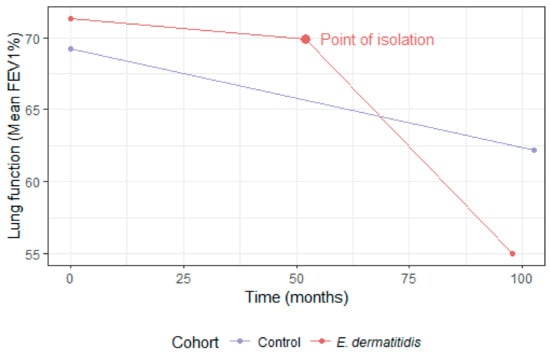 All respiratory cultures conducted over the period of interest from both groups were reviewed in order to establish if growth of non-tuberculous Mycobacterium, Aspergillus fumigatus or Pseudomonas aeruginosa was documented and potentially associated with FEV1% decline. Patients were recorded as being positive or negative for these organisms at the start and end date of data collection and “point of infection” in the E. dermatitidis group. This positive status was determined by at least one isolation culture. The control group was subject to the same patient and data selection limitations as the E. dermatitidis group.