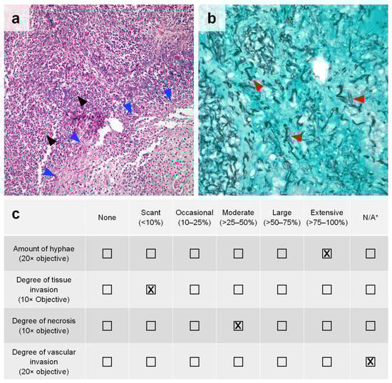 Pulmonary mucormycosis with histopathologic features of interest. (a) H&E staining of lung parenchyma with a moderate (>25–50%) amount of caseous necrosis (blue arrowheads) and acute suppurative inflammation plus scant (<10%) tissue invasion by MCR in cross-section (black arrowheads) at 10× objective. (b) GMS staining of a pulmonary tissue highlighting an extensive (>75–100%) amount of broad hyphae (red arrowheads) characteristic of MCR at 20× objective. No vessels are present on the slide to evaluate vascular invasion. (c) Example scorecard used for the semi-quantitative assessment of included pulmonary MCR cases based on the amount of histopathologic features present in the images shown in panels (a,b). * N/A = not applicable (histological feature was not present on the slide for the pathologist to evaluate).
