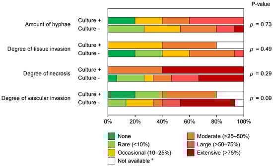Stacked bar chart comparing the distributions of histopathological features of pulmonary mucormycosis in culture-positive and culture-negative patients. Mann–Whitney U test. a One case in the culture-positive cohort could not be evaluated on the degree of tissue invasion due to the lack of a corresponding GMS-stained slide. Additionally, two case specimens (one culture-positive and one culture-negative) did not contain vessels to evaluate vascular invasion.