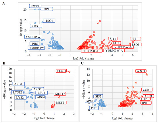 Among the most upregulated genes in M437[L] cells, genes encoding mannoproteins related to iron transport (FIT1, -2, -3), other proteins related to iron (LSO1, SIT1), and putative proteins of unknown functions (YHR175W-A, YDR003W-A, and YLR154C-H) (Figure 1 and Table S1) were identified. The most downregulated genes in M437[L] cells were those encoding the cell wall proteins (CWP1, PIR3), protein kinase (KDX1), and proteins involved in cell wall and membrane biosynthesis (OPI3, YMR084W, YMR085W, and INO1).