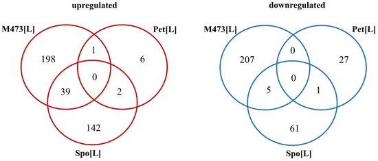 Overall, gene transcription was the most altered (450 genes) in M437[L] cells, less (250 genes) in Spo[L] cells, and the least (37 genes) in Pet[L] cells (Figure 2 and Table S1). The numbers of up- and downregulated genes in M437[L] cells were similar, with 238 genes being up- and 212 being downregulated. Approximately two-thirds (183 genes) of the DEGs in Spo[L] cells were upregulated, and about one-third (67 genes) were downregulated. An inverse distribution of the gene number ratio was observed in Pet[L] cells, where about one-third of the DEGs were upregulated (nine genes) and two-thirds were downregulated (28 genes) (Table S1). The gene transcription patterns were highly different between each cell type; there were no DEGs shared between all three strains, neither upregulated nor downregulated (Figure 2). Only LYS12 was differently expressed in all three strains; however, it was upregulated in M437[L] and Spo[L], but downregulated in the Pet[L] cells.