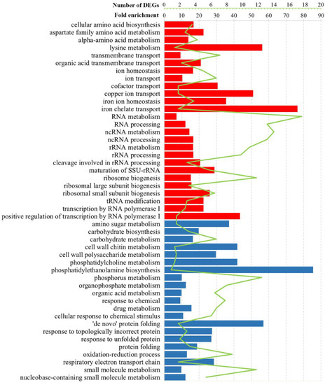 Selected statistically significant enriched gene ontology terms associated with the biological processes of altered transcription genes in S. cerevisiae M437[L] cells. The green line represents the number of DEGs, whereas the bars indicate the fold-enrichment (F.E.) values. Upregulated genes, red; downregulated genes, blue. F.E. values were calculated by dividing the frequency of the specific gene cluster by the total frequency for each GO term according to the data presented in Table S1.