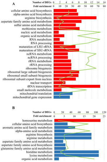 Selected statistically significant enriched gene ontology terms associated with the biological processes of altered transcription genes in (A) S. paradoxus AML-15-66 Spo[L] and (B) Pet[L] cells. The green line represents the number of DEGs, whereas the bars indicate fold enrichment (F.E.) values. Upregulated genes, red; downregulated genes, blue. F.E. values were calculated by dividing the frequency of a specific gene cluster by the total frequency for each GO term according to the data presented in Table S1.