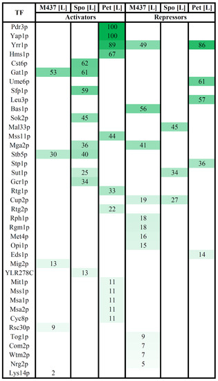 Only several TFs were related with different expressions of a large part of the DEGs. The expression of 53% of the upregulated DEGs in M437[L] cells can be induced by Gat1, and the highest number of downregulated genes (56%) can be associated with Bas1-mediated repression. The transcription of the majority of positively regulated genes of Spo[L] cells is related to the action of Cst6 (62%), Gat1 (61%), and Sfp1 (59%) TFs. The expression of the highest percentage (45%) of downregulated genes in Spo[L] can be repressed by Mal33. Up to 100% of the DEGs in Pet[L] cells can be differently expressed by TFs Yap1 (100% of upregulated genes), Pdr3 (100% of upregulated genes), and Yrr1 (89% of up- and 86% of downregulated genes).
