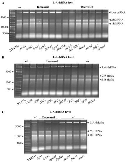To evaluate the effects of gene transcription factors on the L-A dsRNA levels, Saccharomyces cerevisiae strains (BY4741 background, MATa; his3Δ1; leu2Δ0; met15Δ0; and ura3Δ0) were employed. To study the effects of single transcription factor deletions, strains from the S. cerevisiae nonessential gene deletion collection (YKO) with single ORFs replaced by the KanMX4 module were tested. These strains were purchased from Thermo Scientific Molecular Biology (Lafayette, CO, USA). Yeast knockout library (YKO) strains were grown in standard complete medium for yeast growth (YPD) (1% yeast extract, 2% peptone, 2% dextrose; 2% agar was added for solid medium) for 16 h at 25 °C with shaking at 250 rpm.