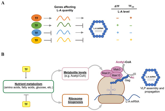 Schematic representation of links between transcription factors (TFs), differently expressed genes (DEGs), and levels of L-A virus. (A) TF can either activate (orange and green TFs) or inhibit (blue and yellow TFs) the transcription of genes. DEGs can either favor or repress the propagation of L-A virus, thereby resulting in alterations of the L-A dsRNA levels. Consequently, the deletion (ΔTF) or overexpression (TFOE) of certain TFs can contribute to changes in gene expression. The elimination or overexpression of certain TFs can change—increase (+) or decrease (−)—the intracellular L-A dsRNA level by changing the balance of transcripts that are important for L-A virus maintenance. All TFs act simultaneously to impact the total amount of L-A virus. (B) Relationship between TFs and known cellular factors affecting L-A virus replication. TFs regulate the transcription of genes involved in nutrient metabolism, which is directly linked to the cellular metabolite levels and ribosome biogenesis. Acetyl-CoA is a substrate for the NatC acetyltransferase complex, composed of Mak3, Mak10, and Mak31 subunits, which is necessary for co-translational Gag protein acetylation. The translation of viral proteins by ribosome and Gag acetylation is essential for L-A virus assembly and propagation.