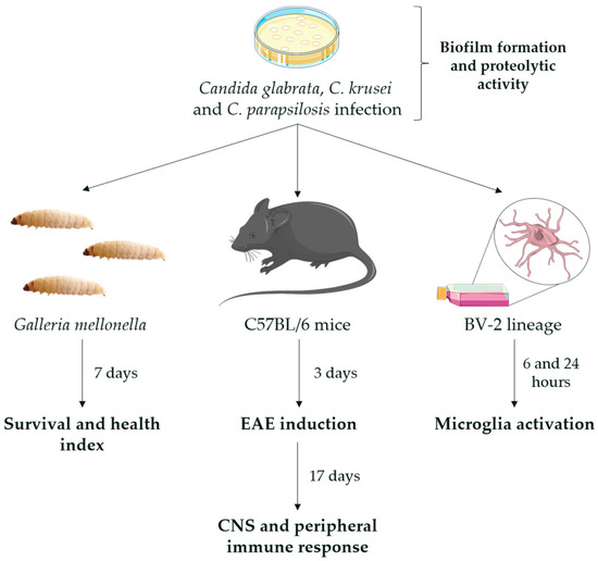 - Fraga-Silva, T.F.C.; Mimura, L.A.N.; Marchetti, C.M.; Chiuso-Minicucci, F.; França, T.G.D.; Zorzella-Pezavento, S.F.G.; Venturini, J.; Arruda, M.S.P.; Sartori, A. Experimental autoimmune encephalomyelitis development is aggravated by Candida albicans infection. J. Immunol. Res. 2015, 2015, 635052. [Google Scholar] [CrossRef] [PubMed] [Green Version]