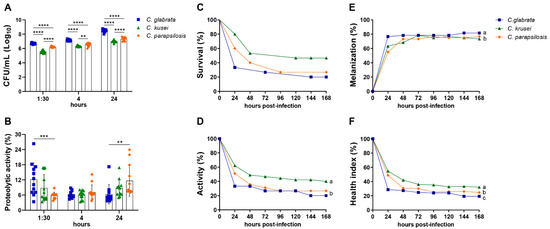 3.1. Biofilm Formation, Proteolytic Activity, and Infection of G. mellonella Showed Variable Virulence Profiles of Candida Strains