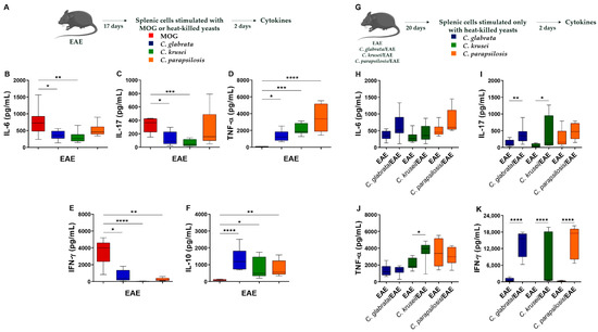 3.3. Th1/Th17 Profiles Induced by C. glabrata and C. krusei Strains Persisted during EAE Development