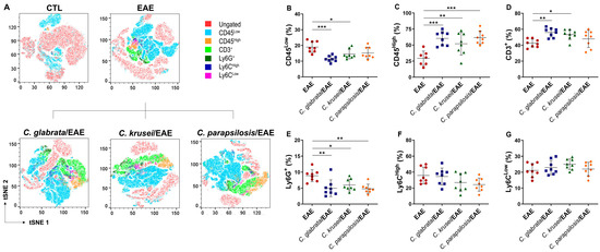 3.4. Previous Candida spp. Infection Increased Leukocyte Infiltration in the CNS of EAE Mice