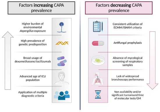 Factors increasing/decreasing prevalence of COVID-associated pulmonary aspergillosis (CAPA).