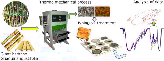 The aim of this work was to propose an eco-friendly alternative method of degrading lignins in G. angustifolia and B. oldhamii samples via thermo-mechanical and fungi methods, as follows and depicted in Figure 1: