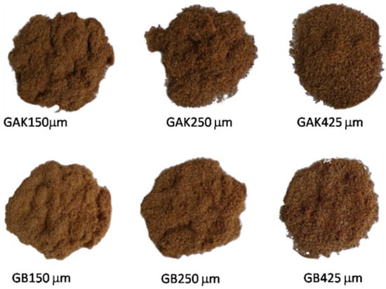 Afterwards, the bamboo bundles were ground and sieved according to ASTM standard E11 [] using a Retsch cutting mill SM 100 mill and an sieve shaker AS 200 control (Retsch, Haan, Germany). Three different fiber sizes were obtained, i.e., 150 µm, 250 µm, and 425 µm, as shown in Figure 2. The fibers were dried at a temperature of 80 °C overnight to stabilize the moisture content to less than 2%.