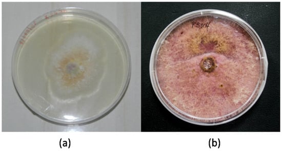 The morphological macro- and microscopic characteristics (as shown in Figure 3 and Figure 4) of the strains allowed for the determination of the species was in the genus Fusarium, which has white-creamy or pinkish-purple aerial mycelium, which resembles either F. oxysporum (as shown in Figure 3a) or F. equiseti (as shown in Figure 3b). Acquisition of images over30 days.