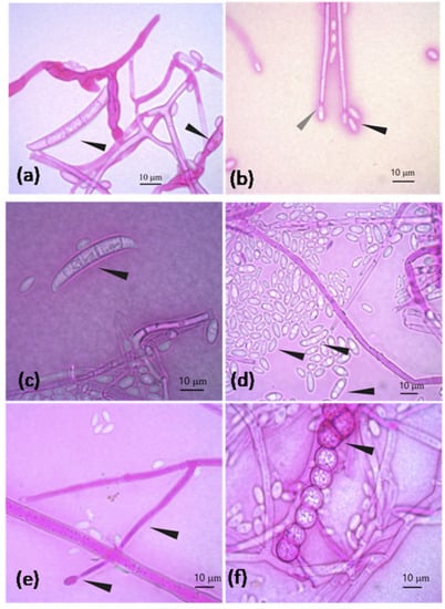 F. oxysporum characteristics: (a) Banana-shaped macroconidia transversely septated and macroconidia in formation; (b) Oval and elongated microconidia (black arrowhead) and elongated conidiophore in conidiogenesis at the end (gray arrowhead) (note: terminal clamidospores were not observed in (b)). F. equiseti characteristics: (c) Banana-shaped macroconidia and transversely septated; (d) Oval and elongated microconidia; (e) Elongated mono-phialide with a transverse septum and conidiogenesis at the end; (f) Chain of verrucous clamidospores.