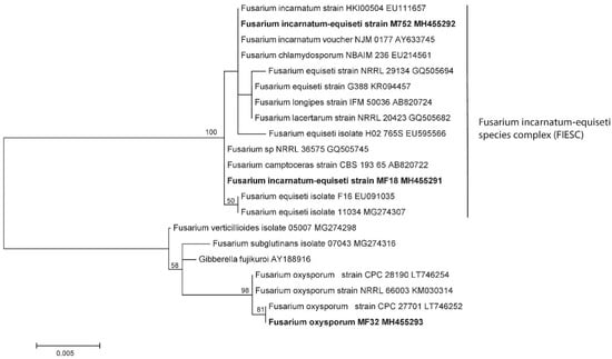 The morpho-species were corroborated by phylogeny, as shown in Figure 5, which clearly distinguished three genotypes belonging to species of the genus Fusarium. The specimen MF32-MH455293 corresponds to F. oxysporum with a 98% bootstrap, while the two remaining sequences were from MF18MH455291 and MF52 MH455292 strains, which fell into the clade F. incarnatum-equiseti species complex (FIESC), maintaining a variation between the species with less than a 1% genetic distance.