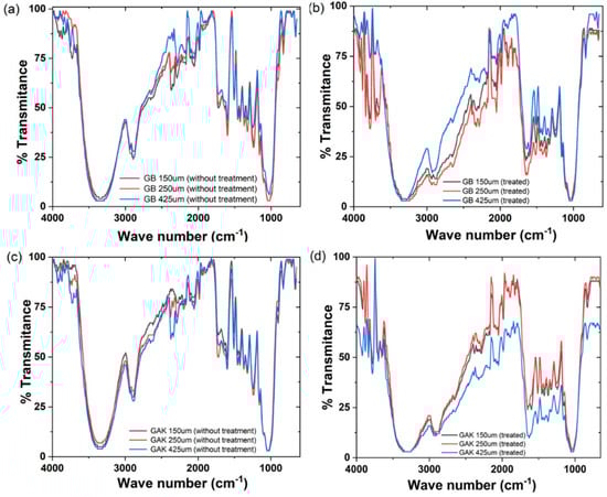 ATR-FTIR results of the giant bamboo (GB) and G. angustifolia Kunt (GAK) fibers at different sieves: (a,c) the untreated control and (b,d) with treatment, respectively.