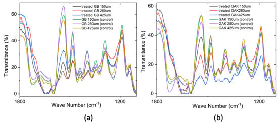 Comparison of the ATR-FTIR spectra at a range of 1800 cm−1 to 1200 cm−1 for the (a) treated GB and control and (b) treated GAK and control samples. A correction baseline was performed.