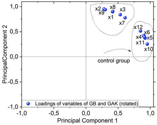 A PCA biplot, as shown in Figure 8, shows the loadings of variables for the GB and GAK cases. As shown, variables X1, X2, X3, X7, X8, and X9 have the most influence on the second component. Interestingly, these variables are associated with the samples treated via thermo-mechanical and fungal methods. Variables X4, X5, X6, X10, X11, and X12 lie on the first component and were associated with the untreated control samples.