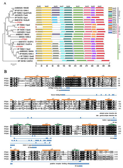 Analysis of Gα amino acid sequences. (A) Phylogenetic analysis of FFGA and the Gα protein from other fungi. The phylogenetic tree was constructed using MEGA software version 6 with a bootstrap method of 1000 replications. Conserved motifs marked in different colors and numbers were generated by MEME tool. Motif 1 contains the G3 box and Switch II region; Motif 2 contains the G1 box; Motif 3 contains the G4 box; Motif 4 contains the G2 box and the Switch I region; Motif 5 contains the G5 box. (B) Multiple sequence alignment and secondary structure features of FFGA1-4. There is a pertussis toxin CXXX (located in C terminus) and cholera toxin RSRVK (located in switch I) in FFGA1. Black background with white letters represents the high-identity region in the amino acid sequence, while secondary structure (α helices and β-sheet) ruler numbering was based on FFGA1.