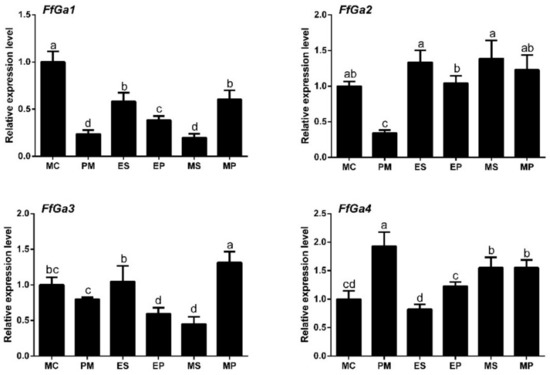 FfGa gene expression patterns during different development tissues. The expression was monitored at MC: mycelium; PM: primordium; ES: elongation stage of stipes; EP: elongation stage of pileus; MS: mature stage of stipes; MP: mature stage of pileus. The GAPDH and RAS genes were used as the reference genes for evaluation of the expression. The expression at the mycelium stage was assigned a value of 1 for normalization. The letters “a”, “b”, “c”, and “d” indicate statistically significant difference at 0.05 level between samples. Bars with no common letters are significantly different (p < 0.05).