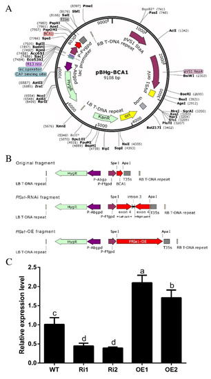 Construction strategy of OE and RNAi vectors and transformants screening. (A) Vector map representing original plasmid pBHg-BCA1 used for the generation of transformants. (B) Cloning strategy showing the RNAi and OE cassette employed in generation of transformants. (C) FfGa1 expression in transformants. The expression of FfGa1 in WT was set as a value of 1. The meaning of “a”, “b”, “c”, and “d” see Figure 2 legend.