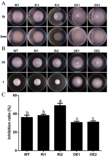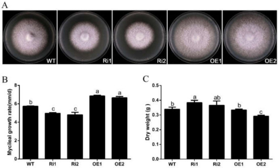 To measure mycelial dry weight biomass, the WT and the transformants were cultured into liquid PDB medium, which was PDA medium without agar, incubated in a dark chamber at 25 °C. After 10 days, mycelium was collected by sterilized sieves, then washed 3 times using sterilized distilled water, pressed between the filter papers to remove water, and dried at 85 °C for at least 12 h.