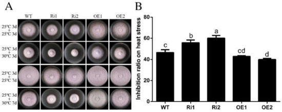 A previous study showed that the PGa1 was involved in the regulation of heat stress response in the fungus Penicillium chrysogenum [36]. To explore the potential role of the FFGA1 subunit in the thermal stress response in F. filiformis, PDA plates inoculated with WT, RNAi, and OE strains were firstly incubated at a normal temperature of 25 °C; three days later, some of the WT, RNAi, and OE strain plates were transferred into a different incubator with a high temperature of 30 °C for 3 days, and the growth rate was measured. In order to obtain a more visible phenotypical difference, the treatment time was prolonged for an additional 4 days to take another photo. Results showed that the RNAi strains were more sensitive to chronical heat stress in comparison to WT, while the OE strains showed high tolerance to thermal stress with maximum colonies in the lower inhibition ratio (Figure 5). Therefore, these results indicate that FfGa1 has a positive impact on thermal resistance in F. filiformis.