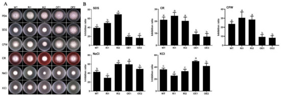 Growth response of WT and transformants under cell wall stress and hypertonic stress. (A) Morphology of WT and transformants cultured on PDA medium supplemented with cell wall stressors, i.e., 0.01% SDS or 200 µg/mL Congo-Red (CR), while 0.3 M NaCl or 0.5 M KCl were used as osmotic stress causing agents for six days. (B) Mycelial growth inhibition ratio of WT and transformants under cell wall stress or hypertonic stress. See Figure 2 legend for explanation of “a”, “b” “c” and “d”.