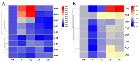 Expression of hydrophobin and chitin synthase genes in transformants. (A) Transcript levels of hydrophobin genes in transformants. (B) Transcript levels of chitin synthase genes in transformants. The expression of genes in WT was set as a value of 1, the results were visualized by TBtools.