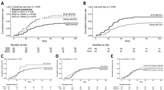 The cumulative incidence of CMV viremia within the first 100 days was 44.4% in MSD, 62.5% in mismatch donors, and 69.0% in MUD (overall log-tank p = 0.005; Figure 1A). The cumulative incidence of CMV viremia was 65.2% in patients who received ATG and 45.1% in patients who did not receive ATG (log-tank p = 0.003, Figure 1B). There were no significant differences between the cumulative incidence of other factors, such as the intensity of conditioning regimen, the usage of TBI, and different acute GVHD grades (Figure 1C–E).