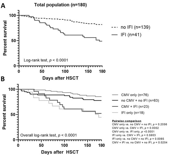 Kaplan–Meier 180-day survival estimates after HSCT. (A) IFI vs no IFI, and (B) four subgroups according to CMV reactivation and IFI.