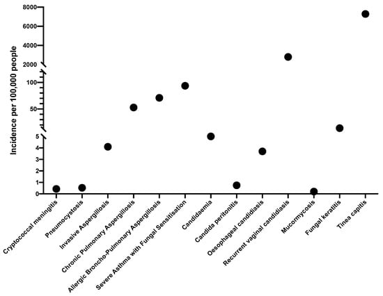 This article was conceived by D.W.D. in accord with a long-term program of estimating the burden of serious fungal disease in each country. All four authors contributed to the data generation, reference acquisition, analysis and writing process. Conceptualization, D.W.D.; methodology, D.W.D., R.O.S.P., B.E.L. and C.H.; investigation, D.W.D., R.O.S.P., B.E.L. and C.H.; data curation, D.W.D.; writing—original draft preparation, D.W.D.; writing—review and editing, D.W.D., R.O.S.P., B.E.L. and C.H.; supervision, D.W.D.; project administration, D.W.D.; funding acquisition, D.W.D. All authors have read and agreed to the published version of the manuscript.